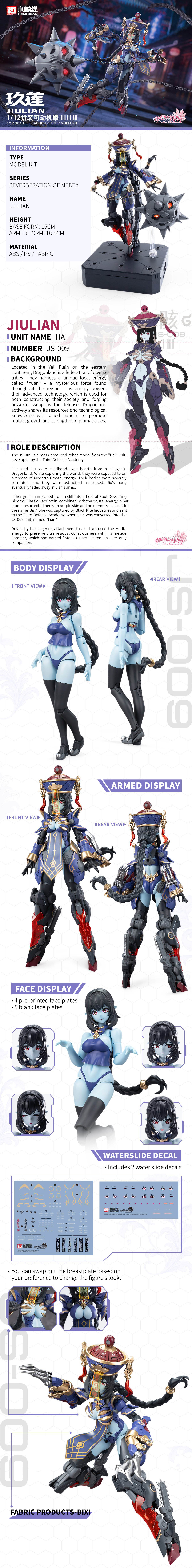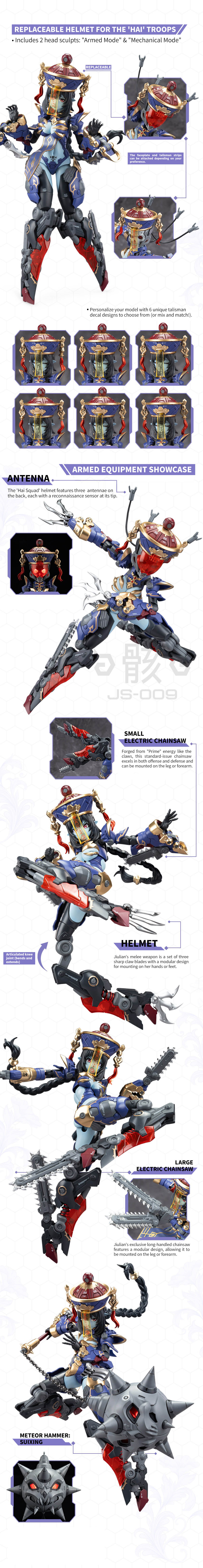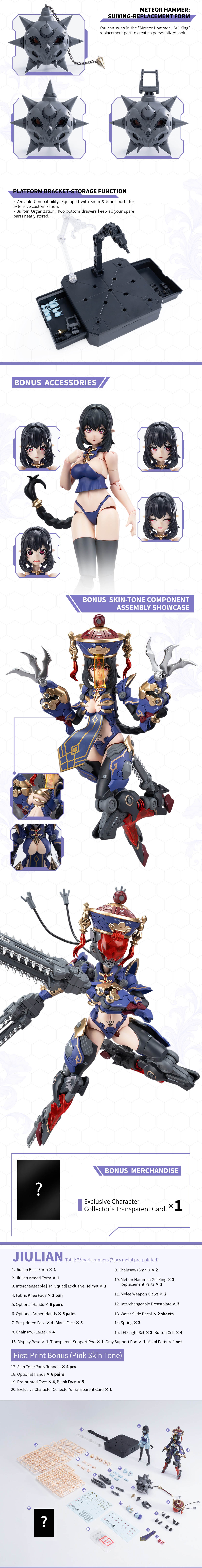[Included Items]: Total of 25 runners (including 3 pre-painted metal ones). Contains: Jiulian Body x1, Jiulian Armored Body x1, Replaceable "[Skeleton Unit]" Special Helmet x1, Fabric Apron x1, Replacement Hands x6 pairs, Replacement Weapon-Holding Hands x5 pairs,Expression Faceplates x4,Blank Faceplates x5,Chainsaw (Large) x4, Chainsaw (Small) x2,Meteor Hammer: Star Crusher x1,Replacement Parts x3, Melee Weapon Claws x2,Replaceable Chest Armor x3,Water Slide Decals x2, Springs x2,LED Light Units x2,Batteries x4,Display Base x1,Transparent Support Rod x1, Gray Support Rod x1, Metal Fittings x1 set