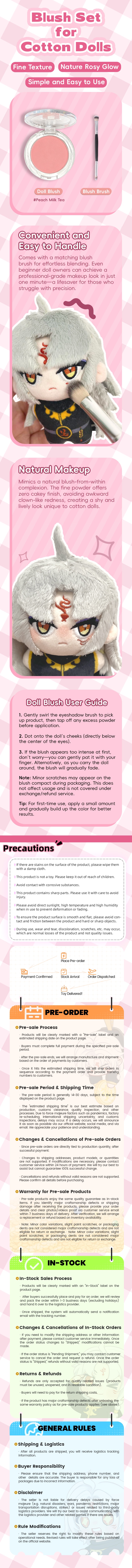 【Usage & Care】Start with a small amount and build up gradually. Dot onto the doll's cheeks. If the color is too strong, gently pat with your finger to lighten. The blush comes in pressed powder form and is fragile - handle with care, avoid pressing too hard or dropping.